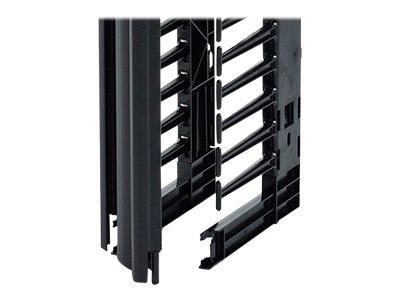 This 6" wide, high capacity vertical cable manager for 2 and 4 post open frame racks features a single-sided cable channel with multiple internal cable tie-off locations and smooth plastic fingers at 1 U increments for organized patching applications.