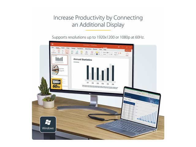Functioning as an external graphics card, this USB to HDMI adapter provides a convenient way to add multi-monitor capability to a USB 3.0-enabled desktop or laptop computer (optimal performance from USB 3.0, backward compatible with USB 2.0).