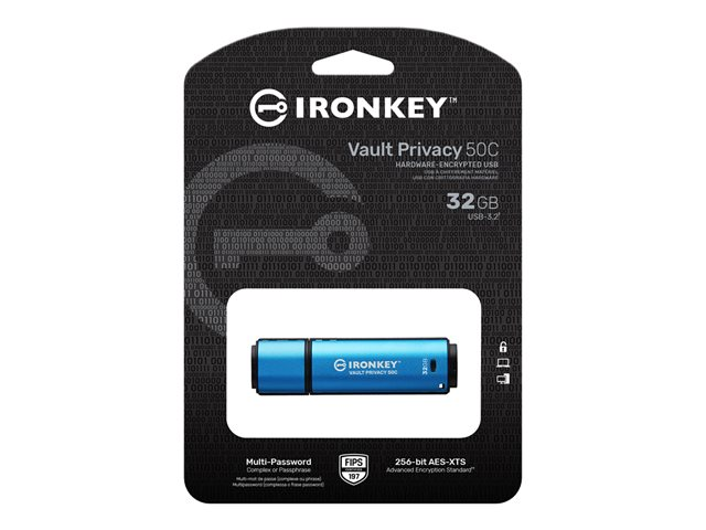 Kingston IronKey Vault Privacy 50 series are premium USB Type-A and USB Type-C drives that provide enterprise-grade security with FIPS 197 certified AES 256-bit hardware-encryption in XTS mode, including safeguards against BadUSB with digitally-signed firmware and against Brute Force password attacks. VP50 has been Penetration Tested (Pen Tested) for enterprise-grade security. Because it is encrypted storage under the user's physical control, VP50 series are superior to using the Internet and Cloud services to safeguard data.