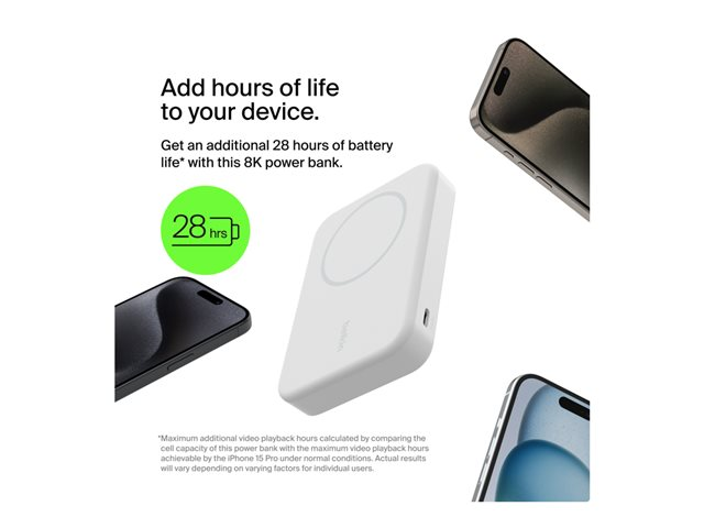 Belkin - Trådløs nødlader - magnetisk med Qi2 - 8000 mAh - 15 watt - Fast Charge (USB-C) - på kabel: USB-C - hvit BPD007BTWH