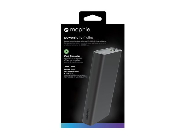 The mophie powerstation ultra offers a 25000 mAh capacity, ensuring power for your devices whether you're on the go or at home. This power bank accommodates your tablet, cellular phone, and laptop, providing a versatile charging solution. With three output connectors, it allows for simultaneous charging of up to three devices, making it a choice for those who need to stay connected without sacrificing time.