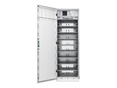 This battery cabinet includes Lithium-ion batteries, Battery Management System (BMS), a switchgear, power supply, and communication interface.
