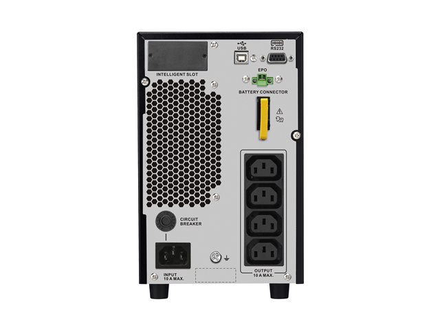 | Egenskaper | Loddrett orientering, hørbar alarm, nødavslåing, LCD display, intern forbikobling, Eco-Mode, generatorkompatibel, Intelligent Battery Management, dobbeltkonvertering, alarm for lavt batteri, overlastalarm |