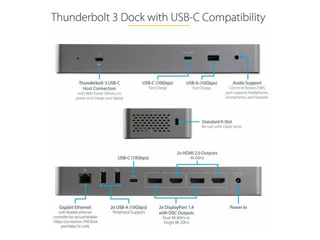 A high-performance Thunderbolt 3 certified docking station with USB Type-C compatibility featuring dual monitor 4K 60 Hz DSC support from either dual or dual HDMI video outputs, 96 W Power Delivery (100 W peak power), 5x USB 3.2 hub with 2x BC 1.2 fast charging ports, Gigabit Ethernet and headset ports.