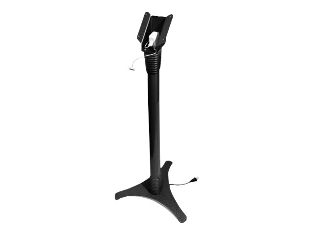 Vårt justerbare stativ kan stilles inn i ulike høyder: 39" - 45" / 100 cm - 115 cm, og stativet gjør det mulig å stille inn nettbrettet i enten stående eller liggende modus. Stativet er designet for maksimal stabilitet med en kraftig stålbase som gir kabelføring gjennom selve stativet. Under kabinettet er det et lite oppbevaringsrom for ladeenheten til nettbrettet.